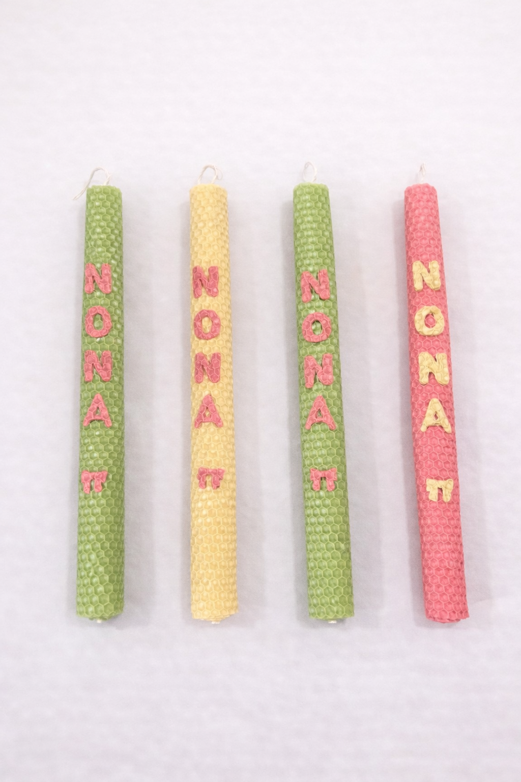 Χειροποίητη πασχαλινή λαμπάδα απο φυσικό κερί μέλισσας με διακόσμηση από γράμματα που είναι επίσης κατασκευασμένα από φυσικό κερί μέλισσας.
