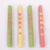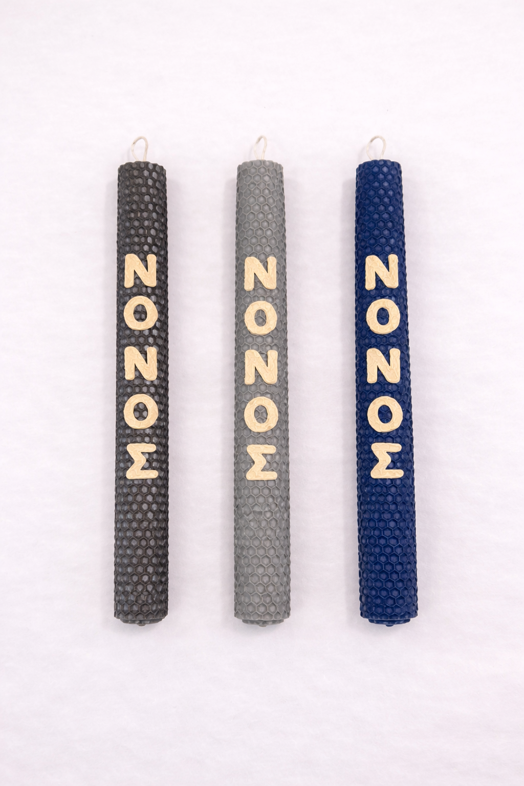 Χειροποίητη πασχαλινή λαμπάδα απο φυσικό κερί μέλισσας με διακόσμηση από γράμματα που είναι επίσης κατασκευασμένα από φυσικό κερί μέλισσας.