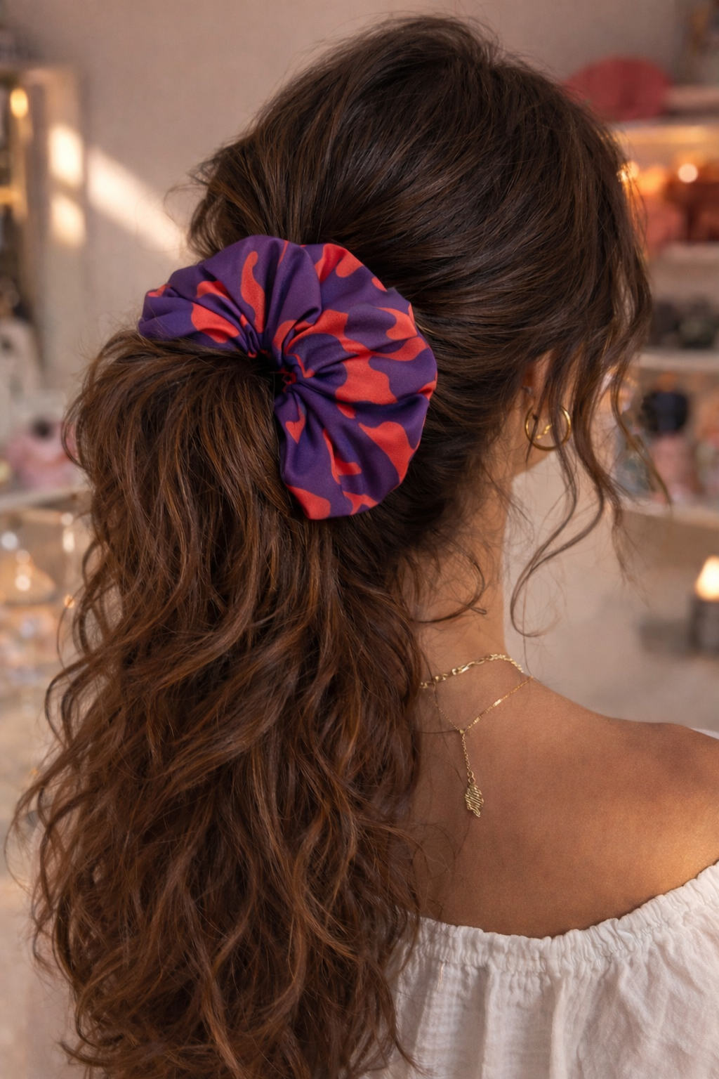 Χειροποίητο σατέν scrunchie με έντονο abstract σχέδιο σε μωβ και κόκκινο. Διαθέσιμο σε Large (17εκ) & XXL (23εκ).