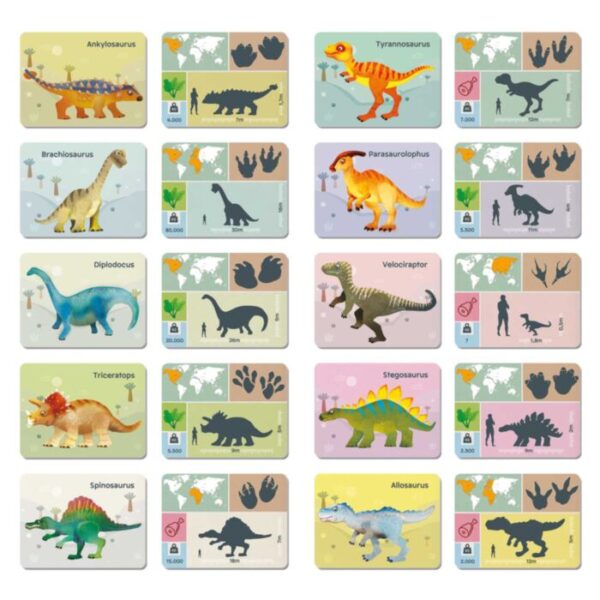 Στη συνέχεια, με τη βοήθεια των δέκα διπλών εκπαιδευτικών καρτών, θα μάθουν που έζησε ο καθένας, τα αποτυπώματά του, τι έτρωγε, το μήκος, το ύψος και το βάρος του.