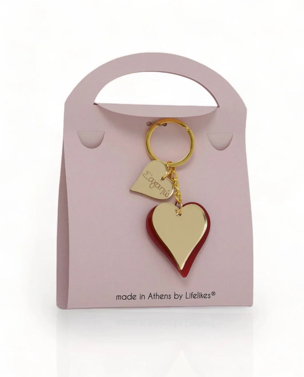 Κάνε την εκλεκτή της καρδιάς σου να αισθανθεί ιδιαίτερη με αυτό το χειροποίητο μπρελόκ που ξεχωρίζει για την ομορφιά και το νόημά του! Το μπρελόκ περιλαμβάνει 2 κρεμαστές καρδιές από plexiglass, σε κόκκινη και χρυσή απόχρωση, με χαραγμένη την ευχή “Σ’αγαπώ”! Το μπρελόκ μπορεί να χρησιμοποιηθεί στα κλειδιά, στην τσάντα ή όπου αλλού επιθυμείτε, προσθέτοντας στυλ και προσωπικότητα. Αυτό το μοναδικό μπρελόκ θα το παραλάβεις σε μια όμορφη συσκευασία δώρου, που στο εσωτερικό της αναγράφονται όμορφες ευχές και μπορείς να προσθέσεις και τις δικές σου!