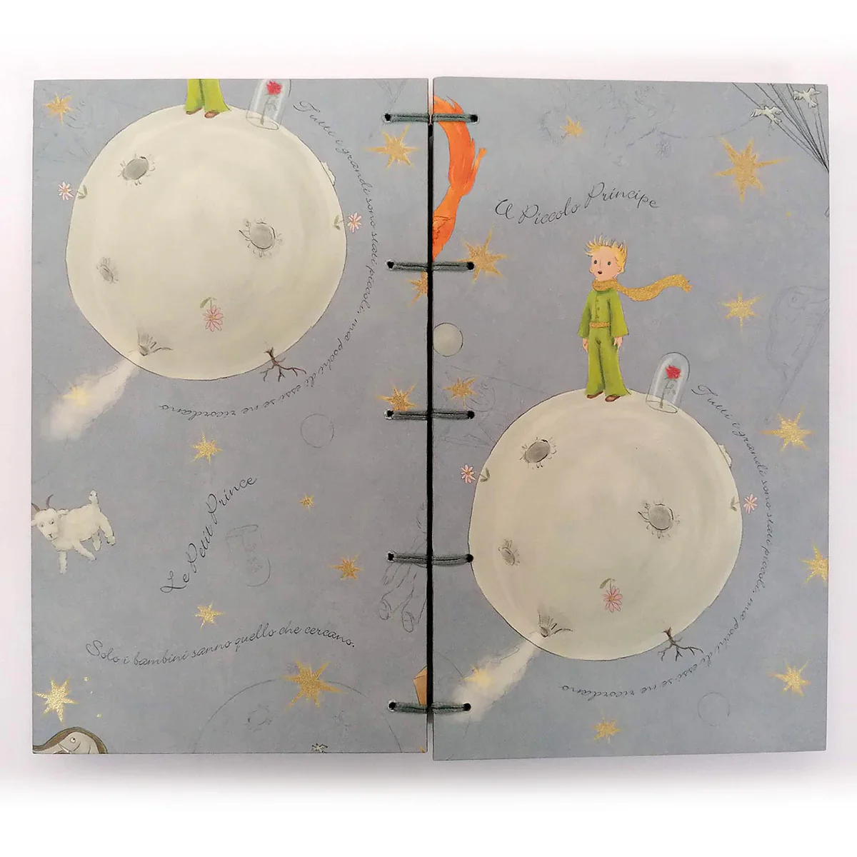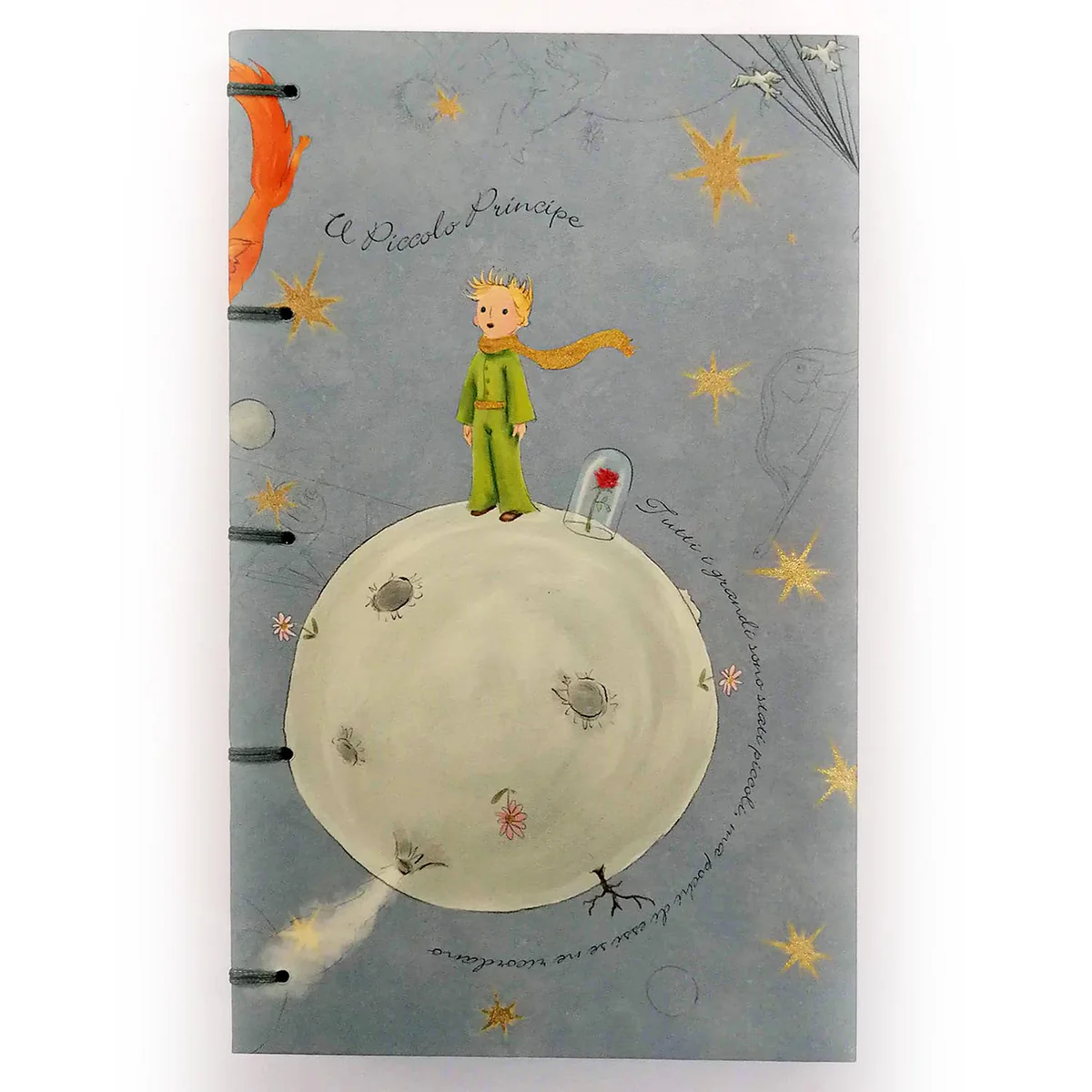 Xειροποίητo σημειωματάριο βυζαντινής βιβλιοδεσίας με τον Μικρό Πρίγκιπα από το studio Artarios, με χοντρό εξώφυλλο και σώμα από οικολογικό χαρτί με γραμμές.