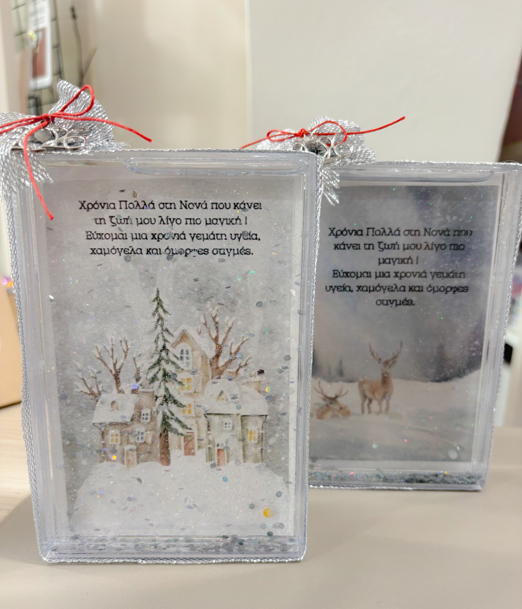 Χειροποίητη glitter κορνίζα με χιονισμένο τοπίο και τρυφερή αφιέρωση. Ιδανικό δώρο για Νονά / Νονό ή για Παππού & Γιαγιά και για κάθε αγαπημένο πρόσωπο!