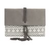 Κομψό υφασμάτινο clutch σε μπεζ–σομόν απόχρωση, με εντυπωσιακό ethnic λουράκι και ροζ λουράκι καρπού.