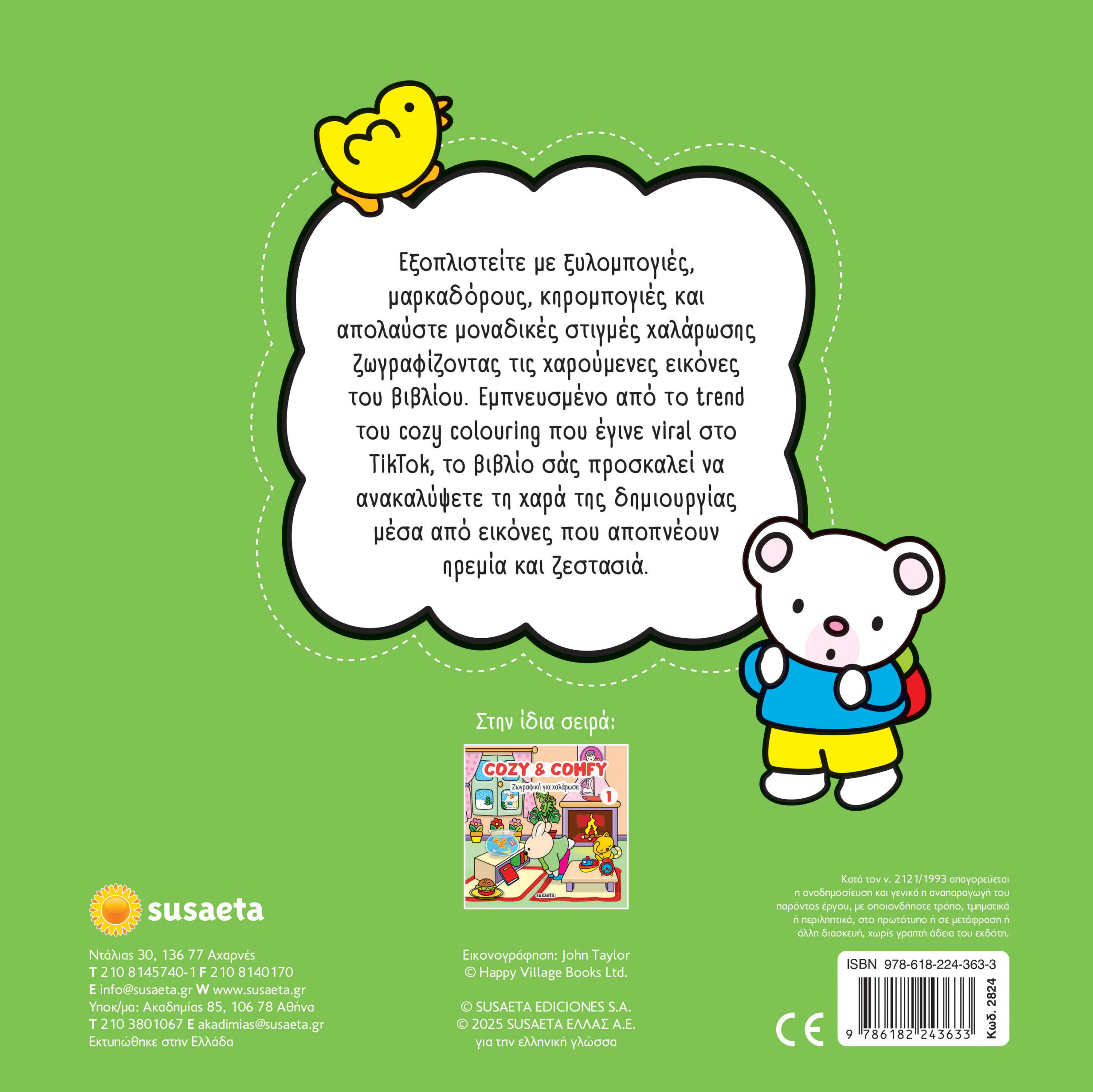 Εξοπλιστείτε με ξυλομπογιές, μαρκαδόρους, κηρομπογιές και απολαύστε μοναδικές στιγμές χαλάρωσης ζωγραφίζοντας τις χαρούμενες εικόνες του βιβλίου. Εμπνευσμένο από τo trend του cozy colouring που έγινε viral στο TikTok, το βιβλίο σάς προσκαλεί να ανακαλύψετε τη χαρά της δημιουργίας μέσα από εικόνες που αποπνέουν ηρεμία και ζεστασιά.