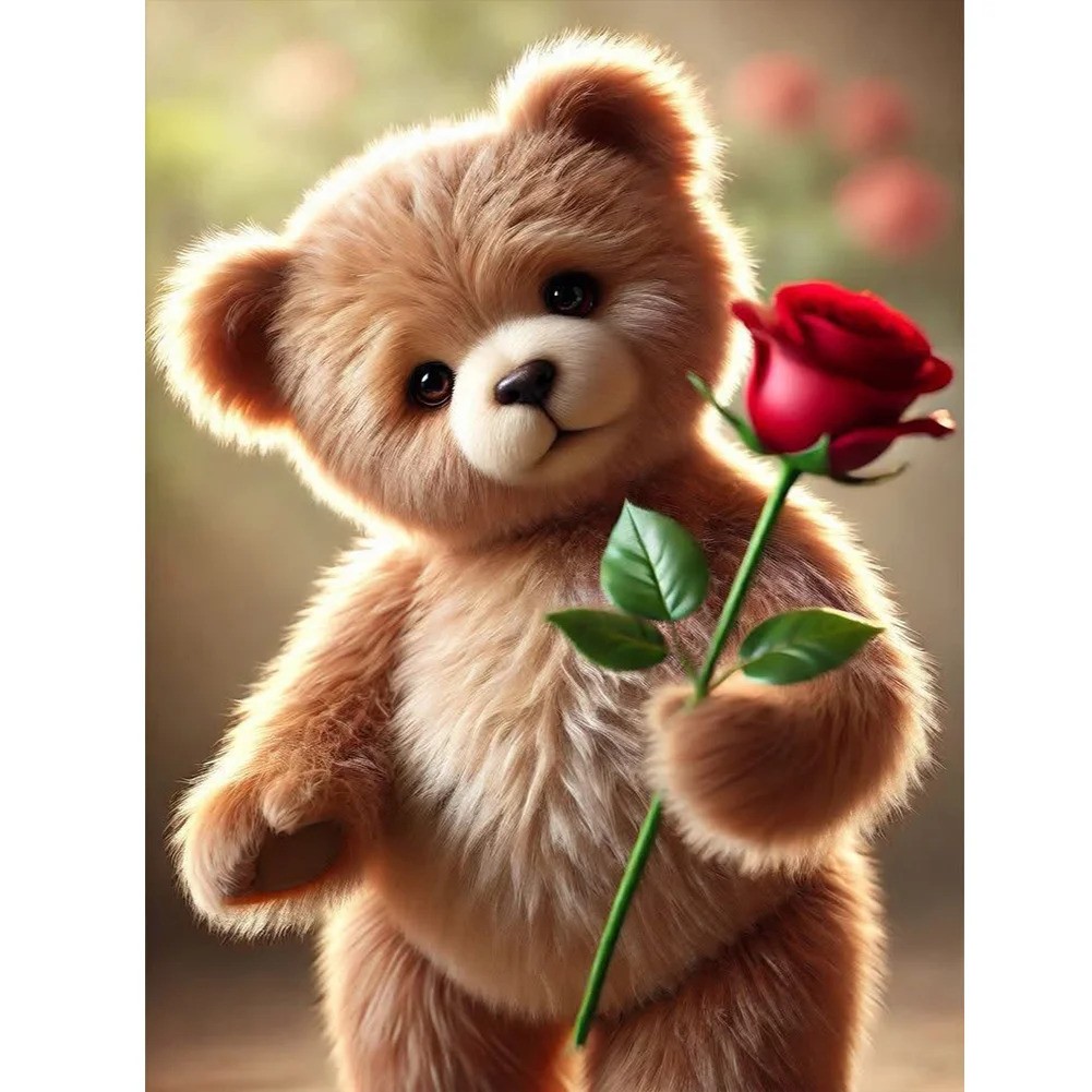 Σετ Diamond Painting με σχέδιο ένα χαριτωμένο αρκουδάκι που κρατάει κόκκινο τριαντάφυλλο.