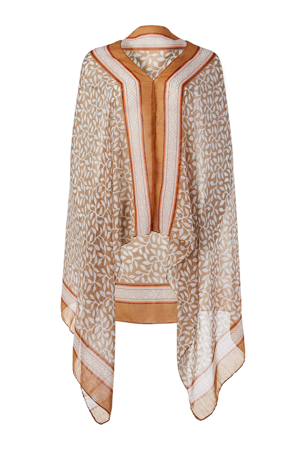 Λεπτή εμπριμέ εσάρπα-παρεό σε καφέ χρώμα, μαλακής ύφανσης — ιδανική για παραλία ή καθημερινή χρήση ως εσάρπα.