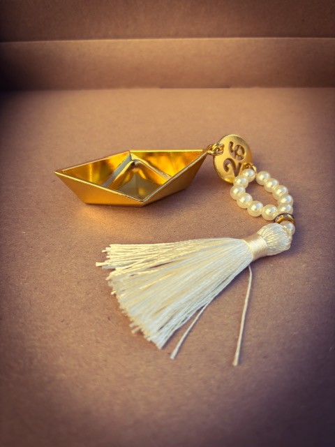 Χειροποίητο γούρι καραβάκι σε χρυσή απόχρωση με αλυσίδα απο πέρλες, φούντα και στοιχείο 2026. Μοναδικό διακοσμητικό δώρο για το νέο έτος.