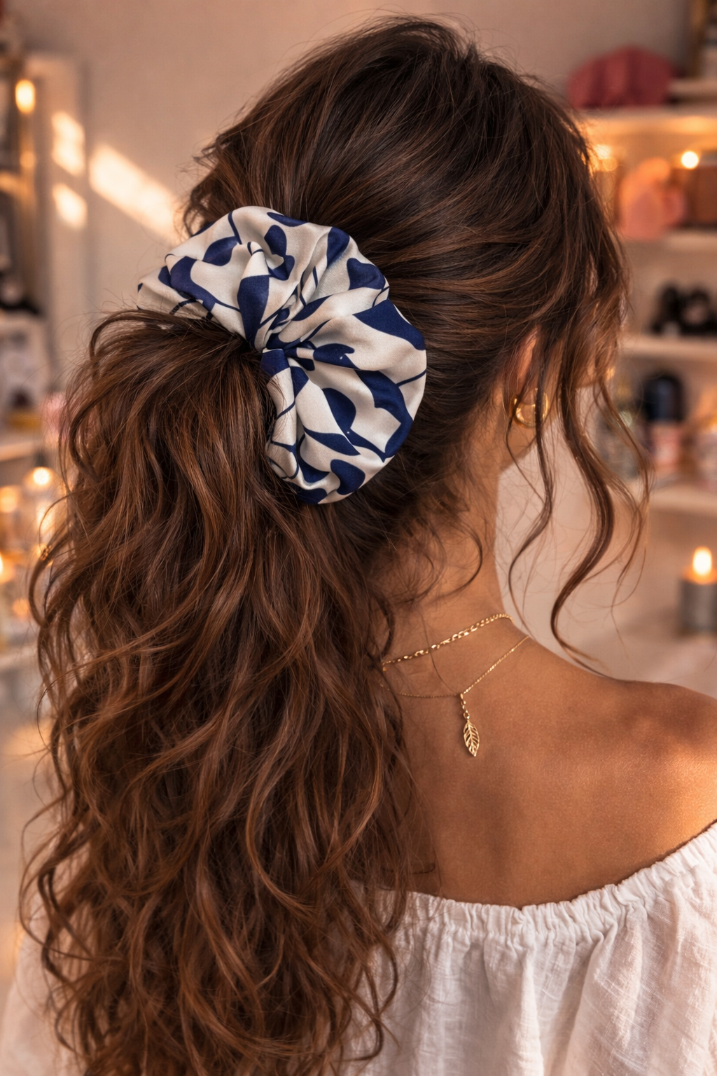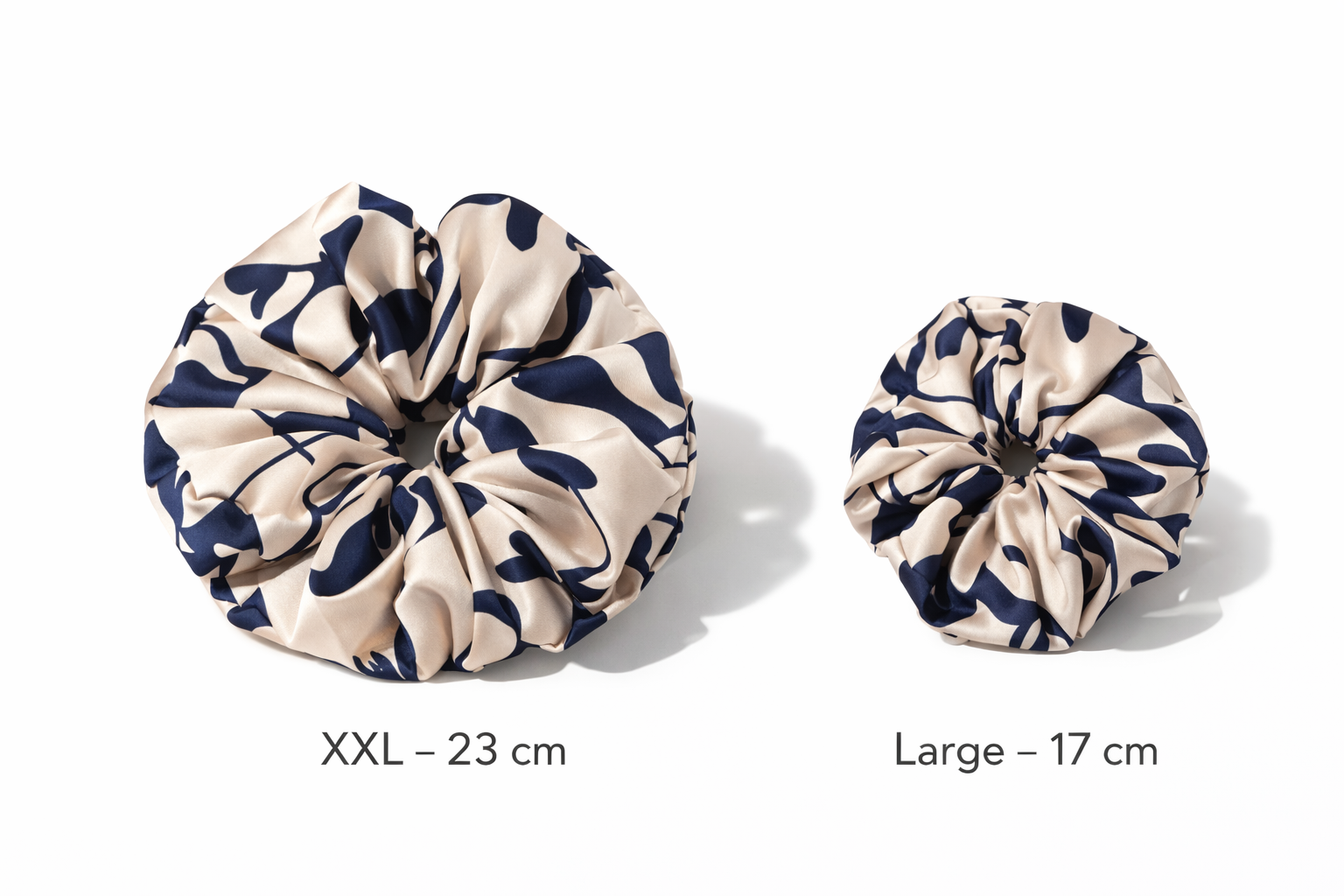 Χειροποίητο σατέν scrunchie σε navy & sand print, διαθέσιμο σε Large και XXL για κομψό ή εντυπωσιακό αποτέλεσμα.