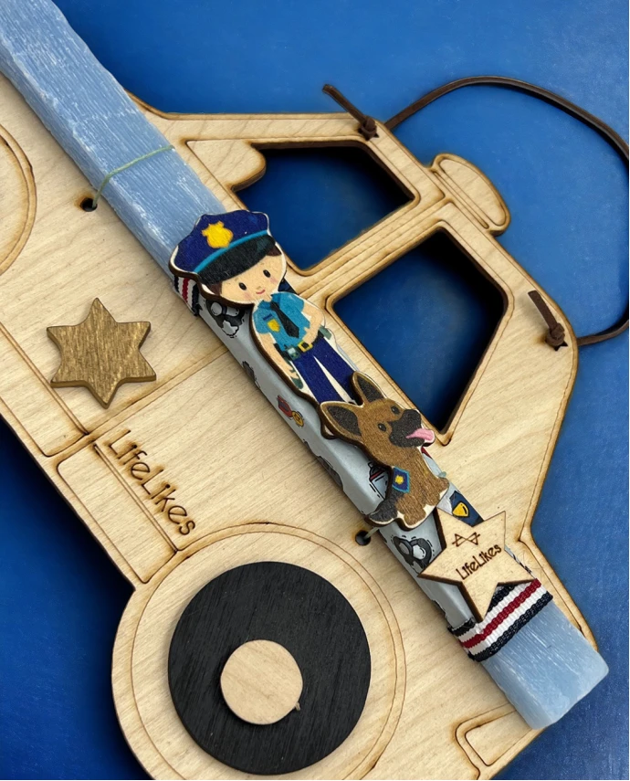 Αν τα αγαπημένα σου βαφτιστήρια ονειρεύονται να γίνουν αστυνομικοί, τότε αυτή η λαμπάδα είναι ιδανική για εκείνα! Το ξύλινο κάδρο σε σχήμα περιπολικού, αφαιρείται, δίνοντας στα παιδιά την ευκαιρία να το χρωματίσουν και να εκφράσουν τη δημιουργικότητά τους κι έπειτα να το κρεμάσουν στον τοίχο! Ο ξύλινος αστυνομικός πάνω στη λαμπάδα, αφαιρείται και είναι μαγνητάκι.