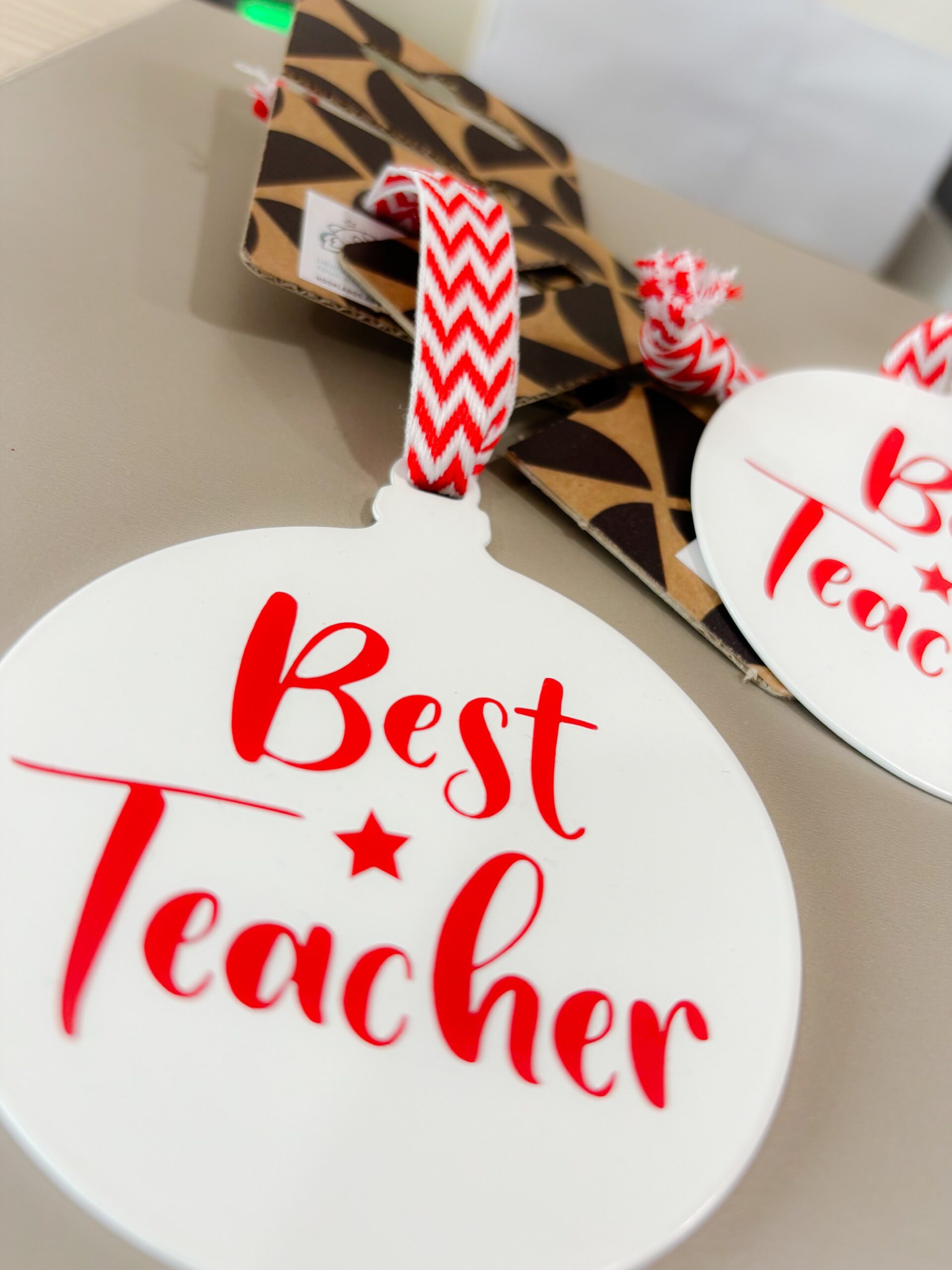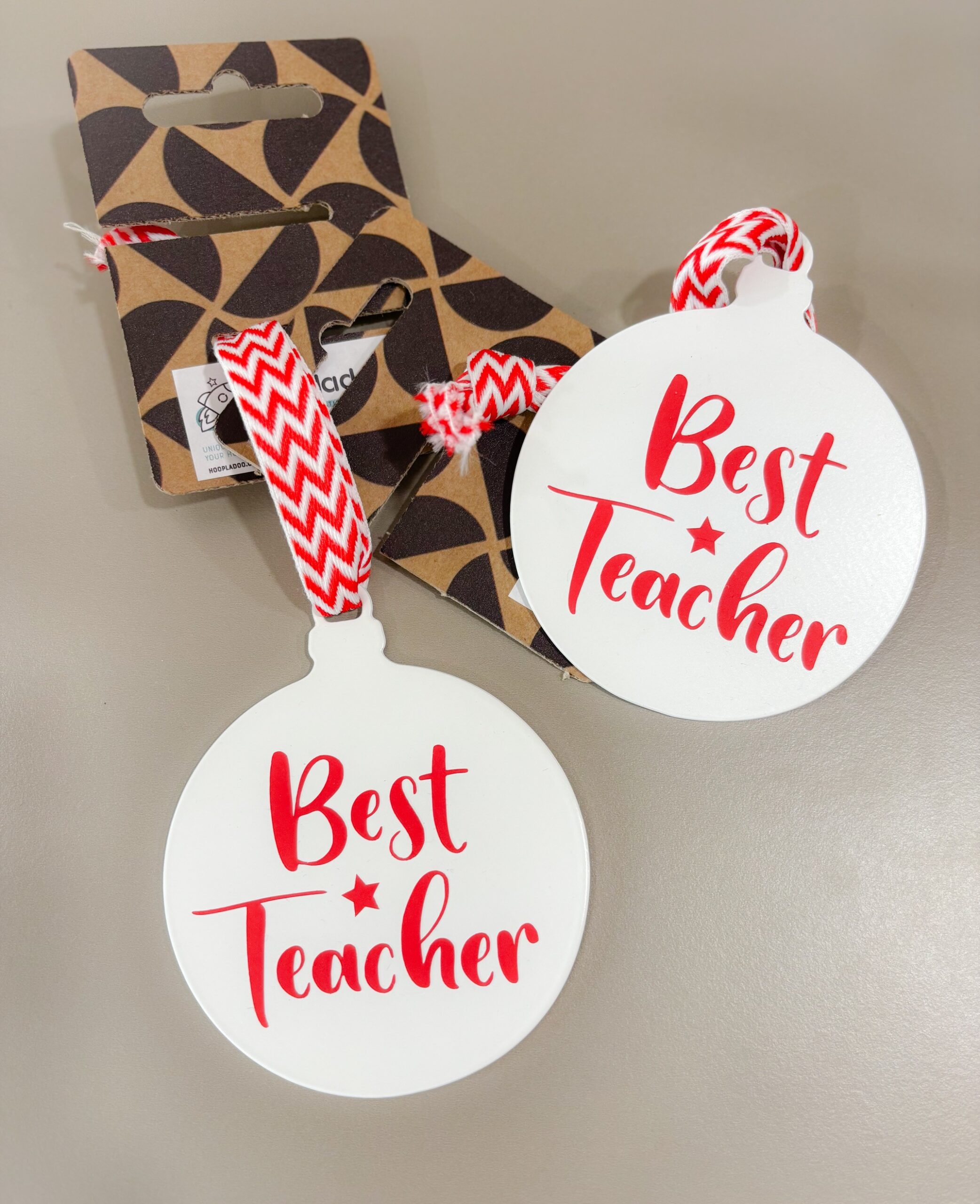 Μοντέρνο μεταλλικό χριστουγεννιάτικο στολίδι “Best Teacher”, ιδανικό δώρο για δασκάλους & νηπιαγωγούς.
