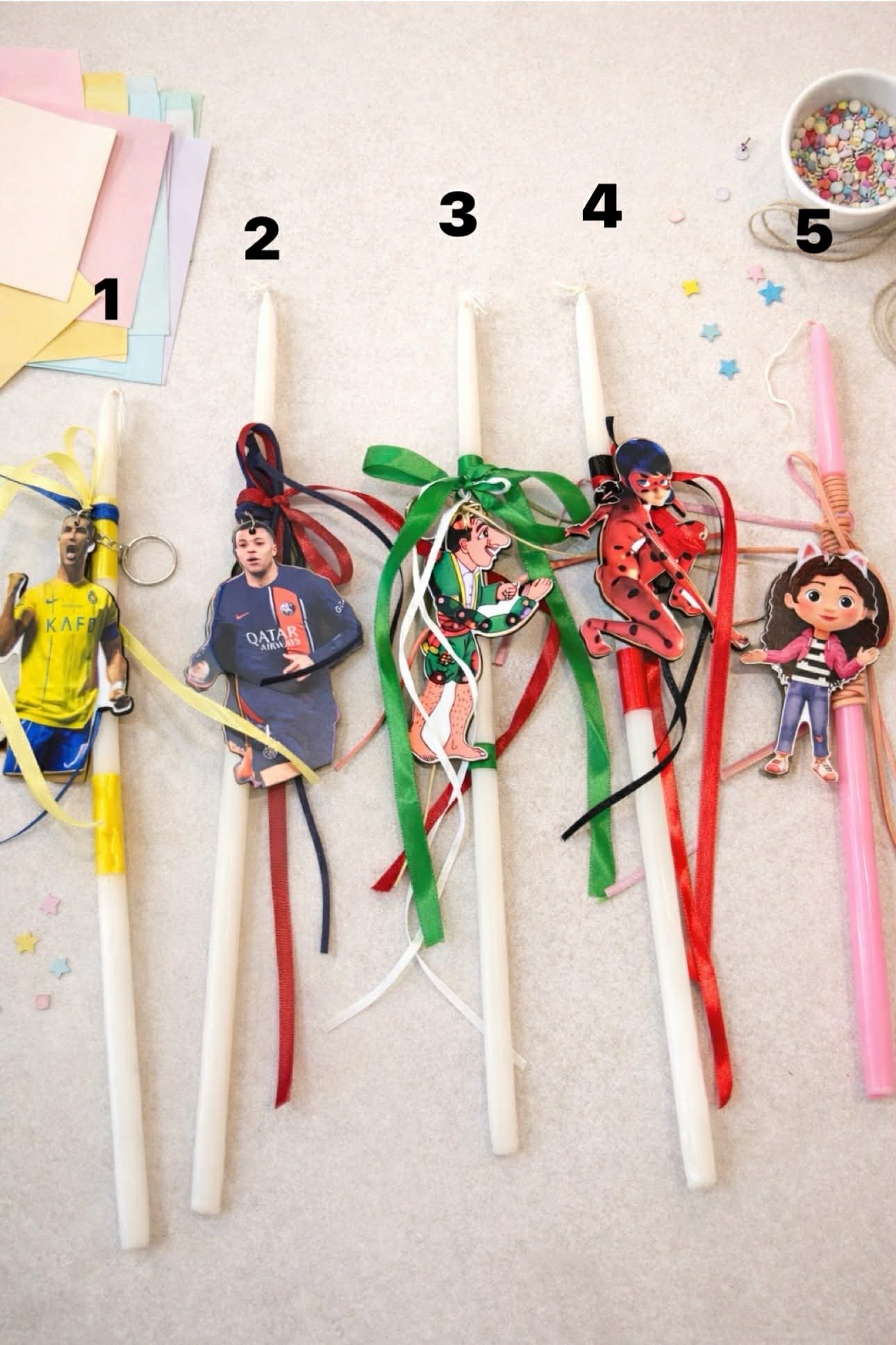 Χειροποίητες παιδικές λαμπάδες με διακοσμητικό ξύλινο μπρελόκ.