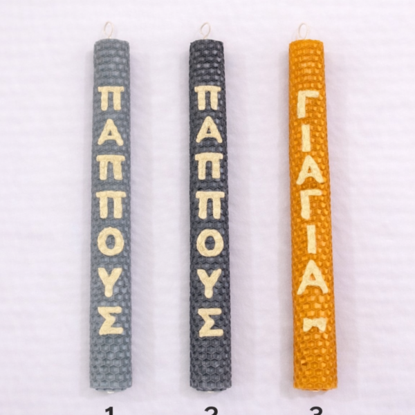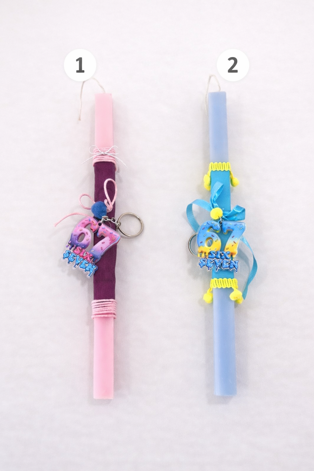 Παιδικές πασχαλινές λαμπάδες διακοσμημένες με μπρελόκ “67” και κορδέλες σε χαρούμενα χρώματα.