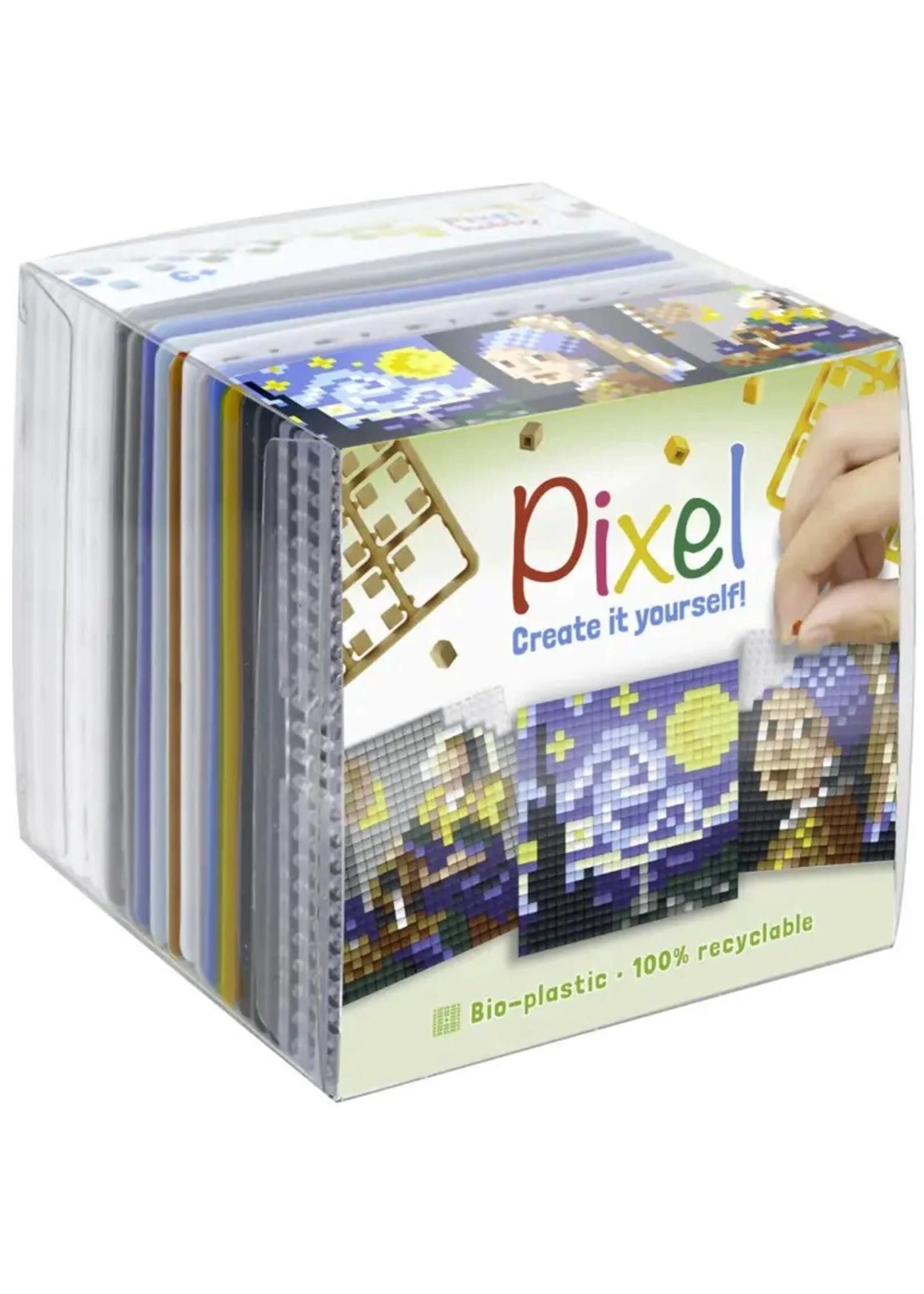 Δημιουργικό σετ κατασκευής ψηφιδωτού Pixelhobby με θέμα τα Έργα Τέχνης. Περιλαμβάνει βάσεις, πρότυπα και pixel για να φτιάξεις διάσημα καλλιτεχνικά μοτίβα σε μορφή pixel art.