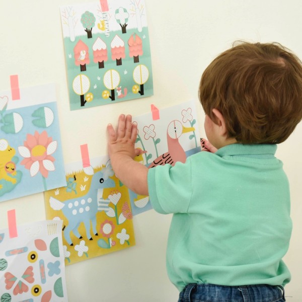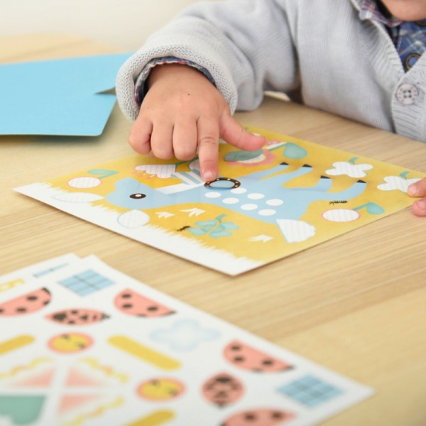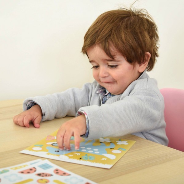 Στην ηλικία που το παιδί αρχίζει να χειρίζεται με ακρίβεια τις κινήσεις του, το να παίζει με τα αυτοκόλλητα είναι μια εξαιρετική άσκηση που προάγει την ηρεμία και τη συγκέντρωση και συμβάλλει στην ανάπτυξη της λεπτής κινητικής του δεξιότητας καθώς και της αναγνώρισης χρώματος και σχήματος. Το παιδί ενθαρρύνεται να παρατηρήσει τις λεπτομέρειες στην εικόνα και τα χρώματα, να αναγνωρίσει και να ονομάσει κάθε στοιχείο. Τα αυτοκόλλητα αφαιρούνται πολύ εύκολα από τις κάρτες και μπορούν να επανακολληθούν σε αυτές άπειρες φορές.