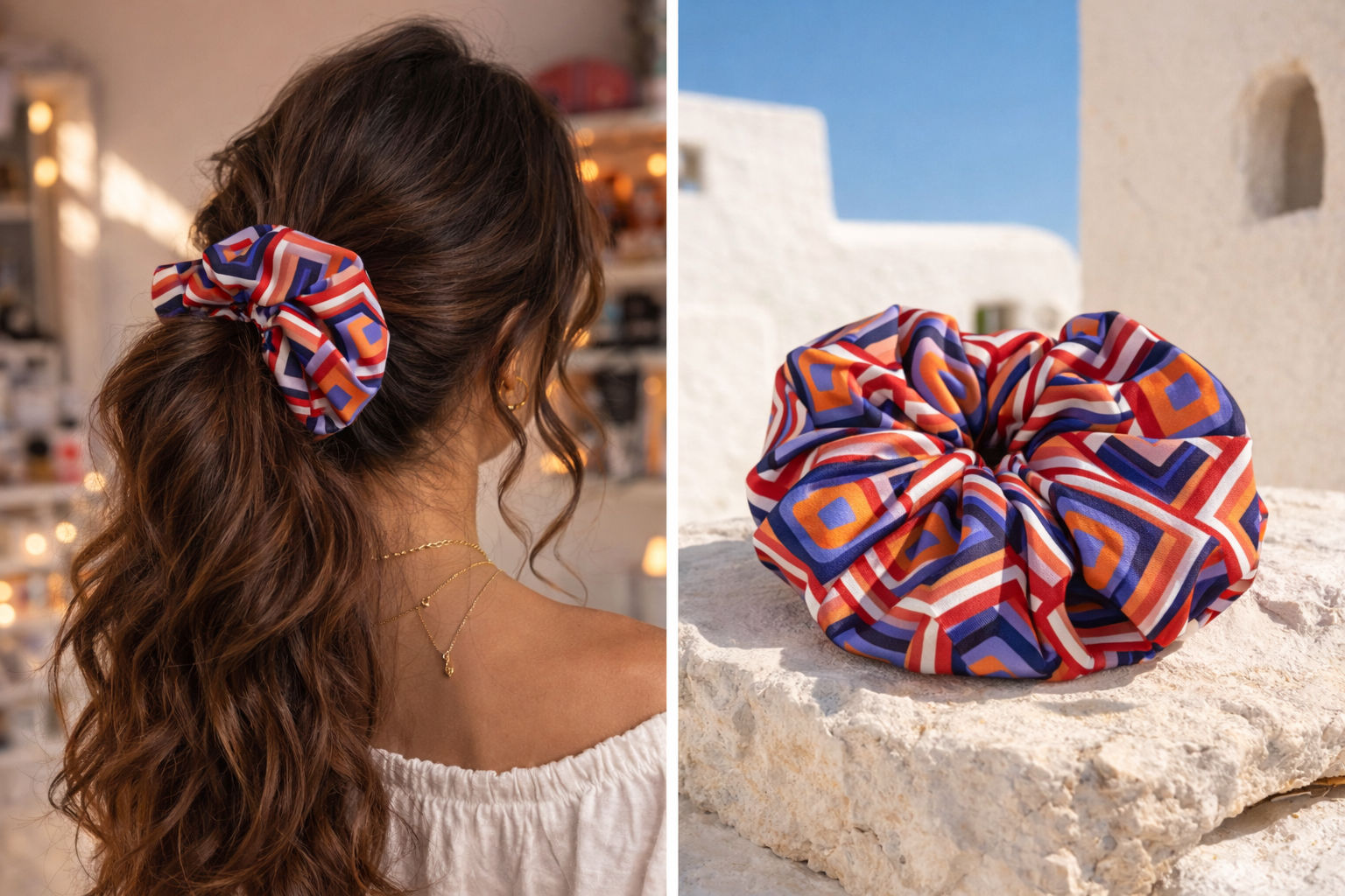 Κάθε scrunchie κατασκευάζεται προσεκτικά στο εργαστήριό μας, με έμφαση στη λεπτομέρεια και στην ποιότητα ραφής. Το σατέν ύφασμα χαρίζει διακριτική λάμψη και απαλή υφή, ενώ το γεωμετρικό μοτίβο σε κόκκινους, μπλε και πορτοκαλί τόνους δημιουργεί ένα δυναμικό, statement αποτέλεσμα.