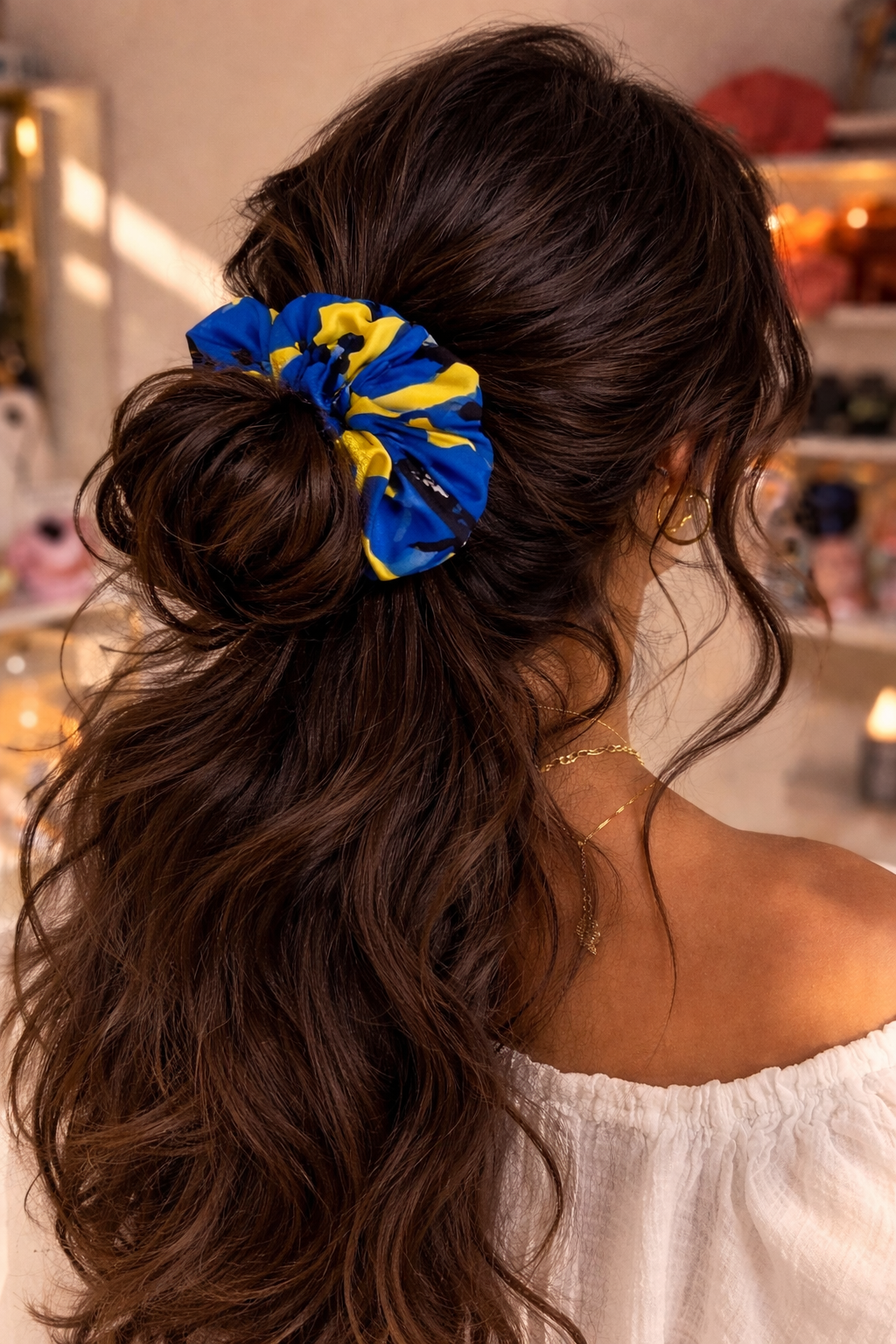 Statement scrunchie σε έντονο μπλε και κίτρινο μοτίβο, ιδανικό για καθημερινά και καλοκαιρινά looks.