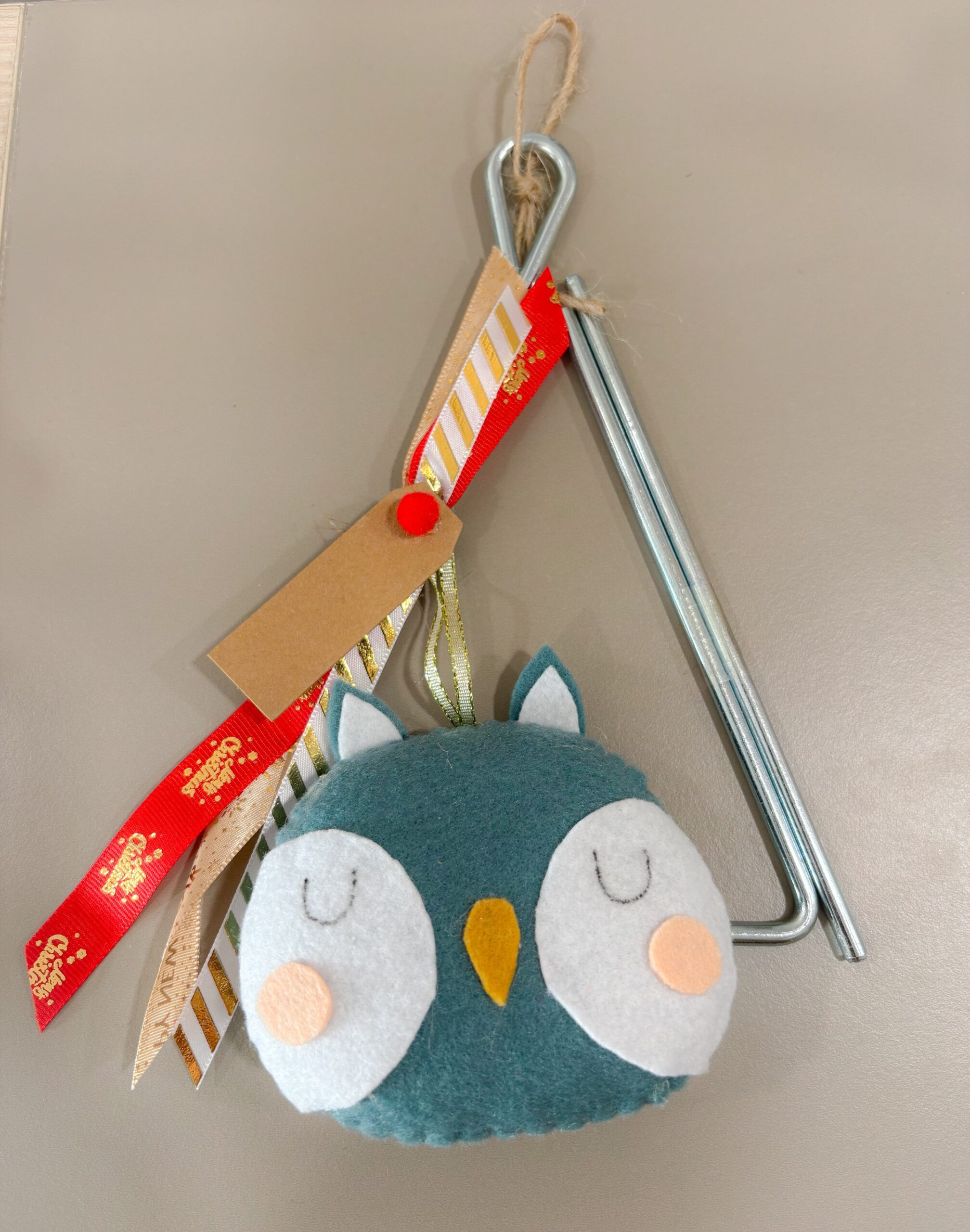 Κάθε κομμάτι διαθέτει μεταλλικό τρίγωνο διακοσμημένο με γιορτινές κορδέλες και μια τσόχινη κρεμαστή φιγούρα: